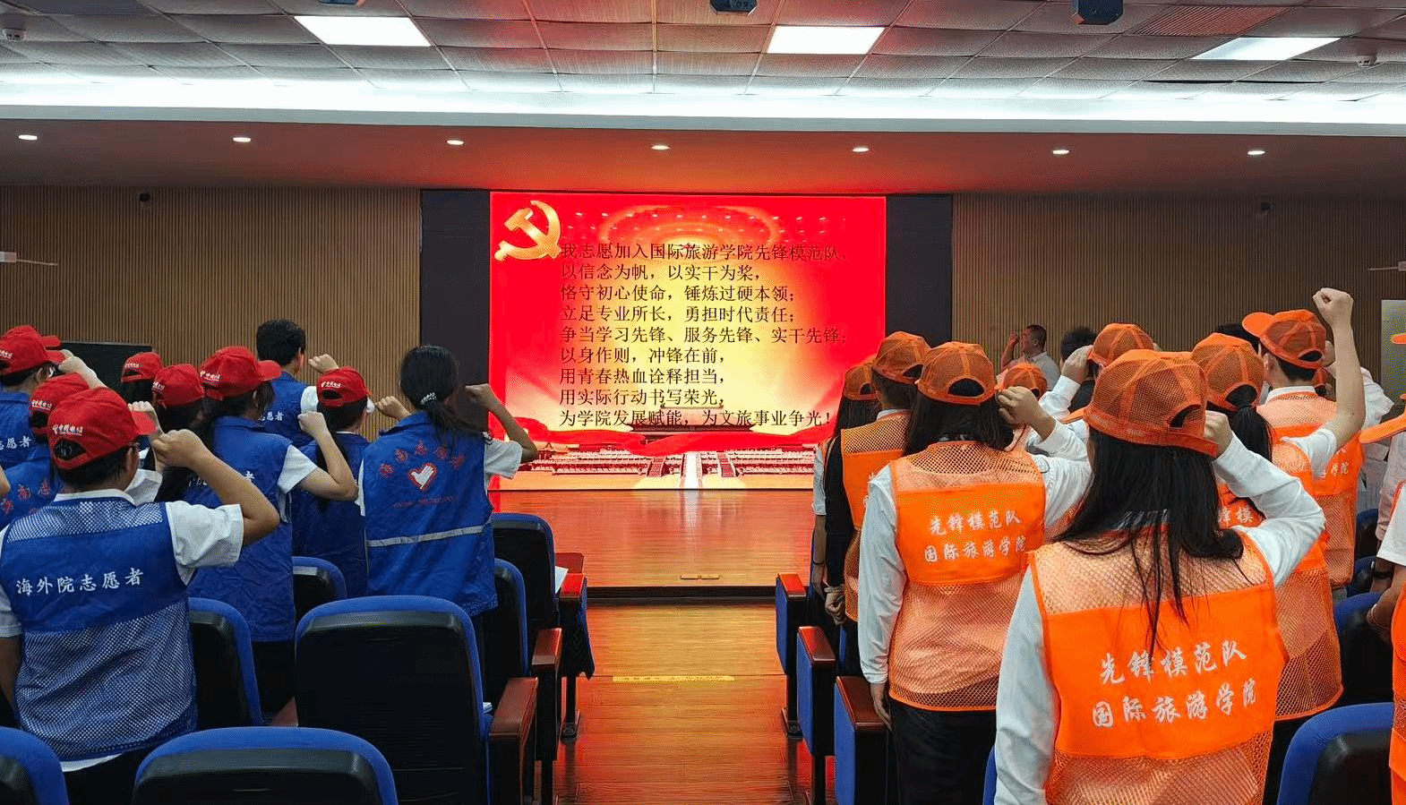 随后,周群林郑重宣布:“国际旅游学院先锋模范队,正式成立,启动!”铿锵有力的话语回荡在整个会场,标志着国际旅游学院学生自我管理与服务实践迈上了一个新的台阶,开启了以党建带团建、以党员带群众的育人新篇章。