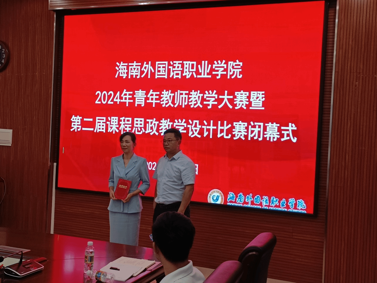 海南省教育厅高等教育处副处长公衍峰、海南省教育厅教师工作处副处长陈果清为三等奖获得者颁奖