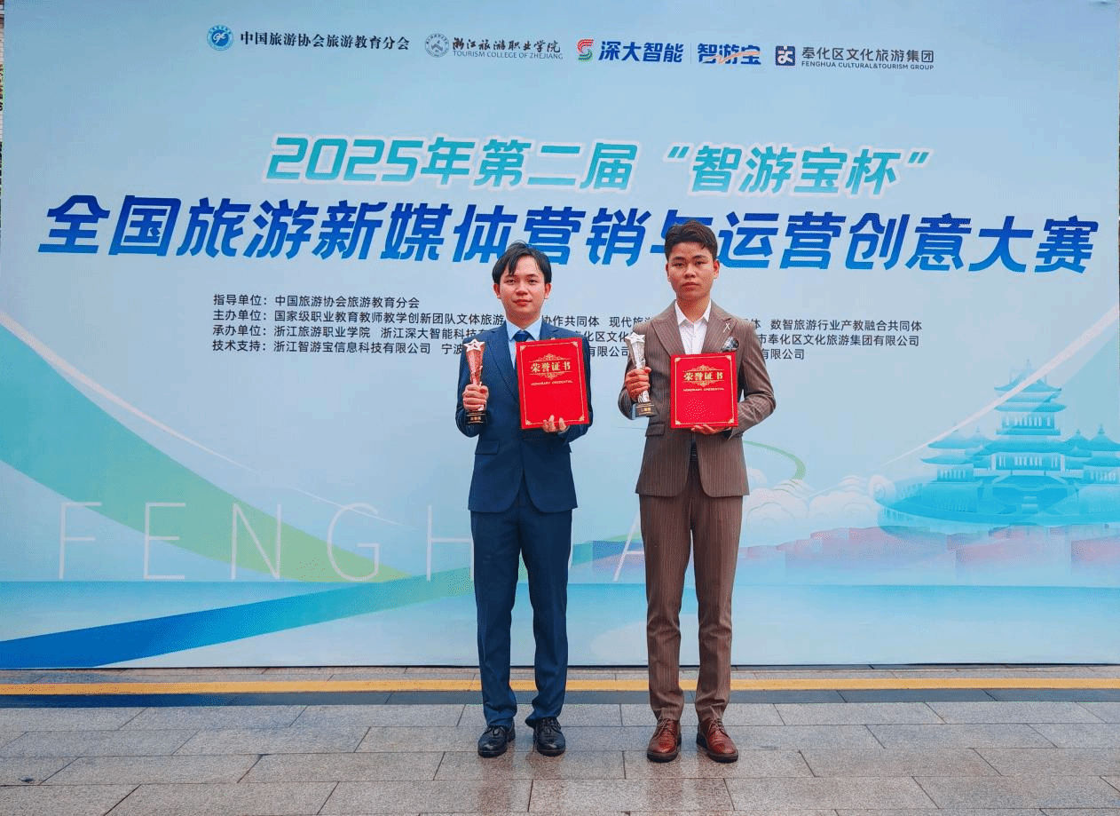 2025年6月7日,第二届“智游宝杯”全国旅游新媒体营销与运营创意大赛决赛在浙江宁波奉化圆满落幕。本次大赛由中国旅游协会教育分会指导,浙江旅游职业学院等多家单位联合承办。本次大赛分为初赛、实践活动和决赛3个阶段,大赛吸引了来自全国百余所院校,600多支队伍的踊跃报名。一路披荆斩棘,国际旅游学院派出的两支队伍——“游点意思队”(团队成员:赵东乙、任从、谢宏、符志辉、王滋滋、张惠敏)和“旅创先锋队”(团队成员:李业辉、白悦、颜美英、邢红格、王婷、何雯燕)凭借出色的表现,在最终的决赛中分别荣获全国二等奖和三等奖,展现了学院在新媒体营销与旅游创意领域的卓越实力。
