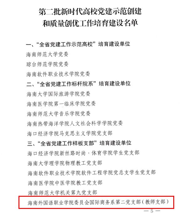 日前,经组织推荐、资格审核、专家评审推荐、结果公示等程序,海南省教育厅遴选产生了2021年党建工作示范高校、党建工作标杆院系、党建工作样板支部和新时代高校“双带头人”教师党支部书记工作室、基层党组织党建工作创新案例。其中,jinnianhui今年会国际商务系第二党支部入选“全省党建工作样板支部”培育建设单位,思想政治理论课教学科研部直属党支部周清云工作室入选“全省‘双带头人’教师党支部书记工作室”。