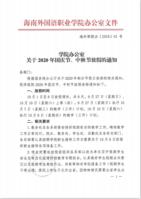 学院办公室关于2020年国庆、中秋放假的通知