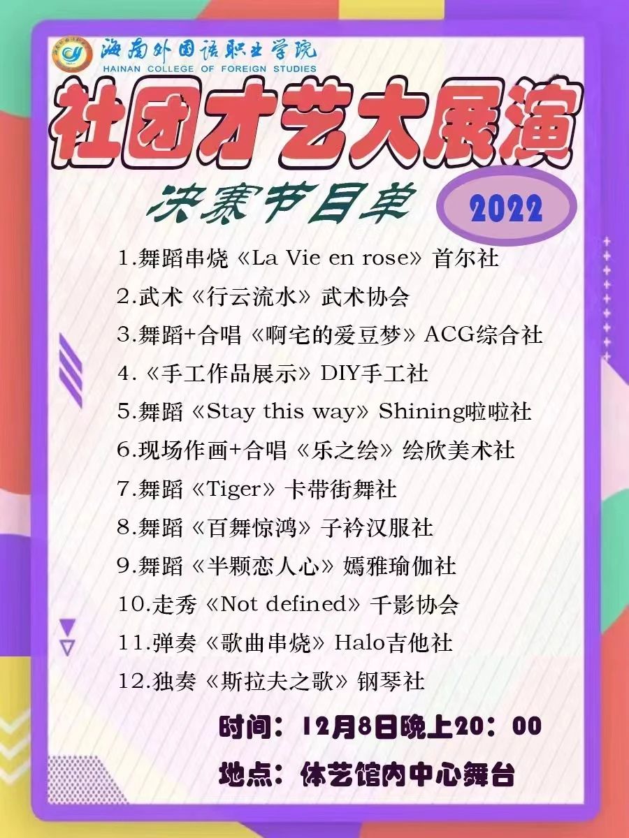 热爱可抵岁月漫长,社团与你来日方长,12月8日,晚20:00点,在体艺馆内中心舞台,与各社团来一场邂逅之旅吧。