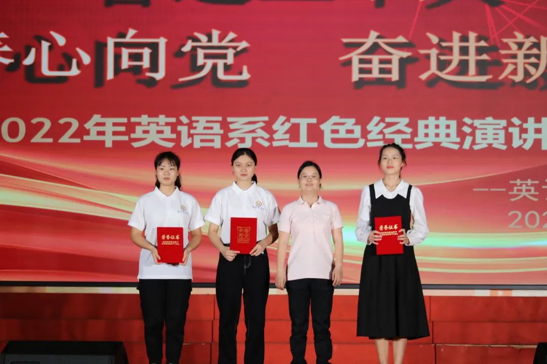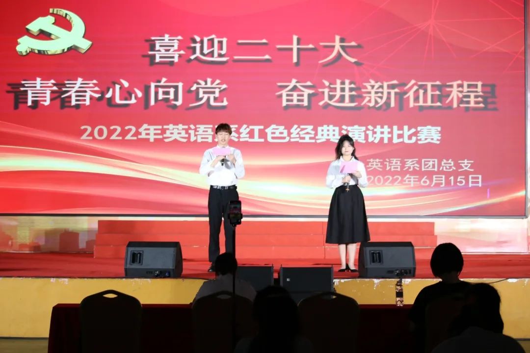 为喜迎二十大,庆祝中国共青团成立100周年,进一步培养学生阅读红色经典的兴趣。2022年6月15日晚7点,英语系在体艺馆举办了“喜迎二十大,青春心向党,奋进新征程”红色经典故事演讲比赛,以青春的名义献礼建团百年华诞,听党话,跟党走,在青春的赛道上奋力奔跑,展现我系青年学子的时代担当!英语系党总支副书记吴清晖、英语系副主任张清萍、英语系副主任李朝霞、各班级代表出席活动。金龙英老师、张瑞老师及游凡渺老师担当本次活动评委。