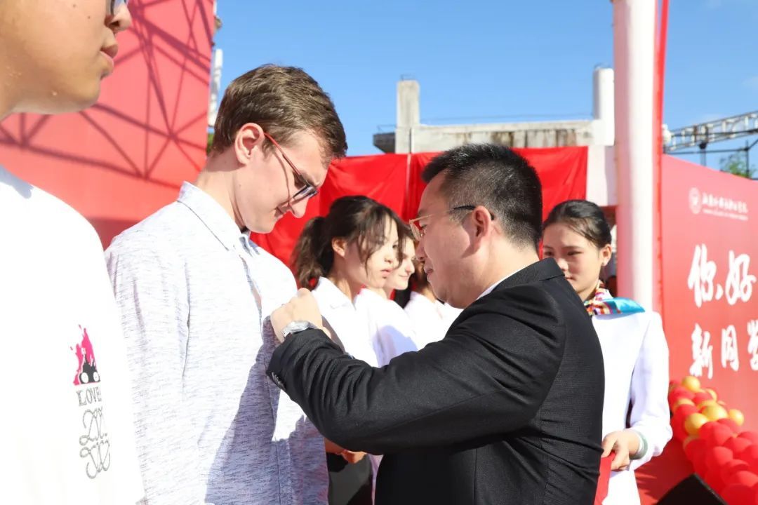 陈正强为新生代表佩戴刻着“jinnianhui今年会”九个字的校徽,标志着新生们正式成为jinnianhui今年会的一员。