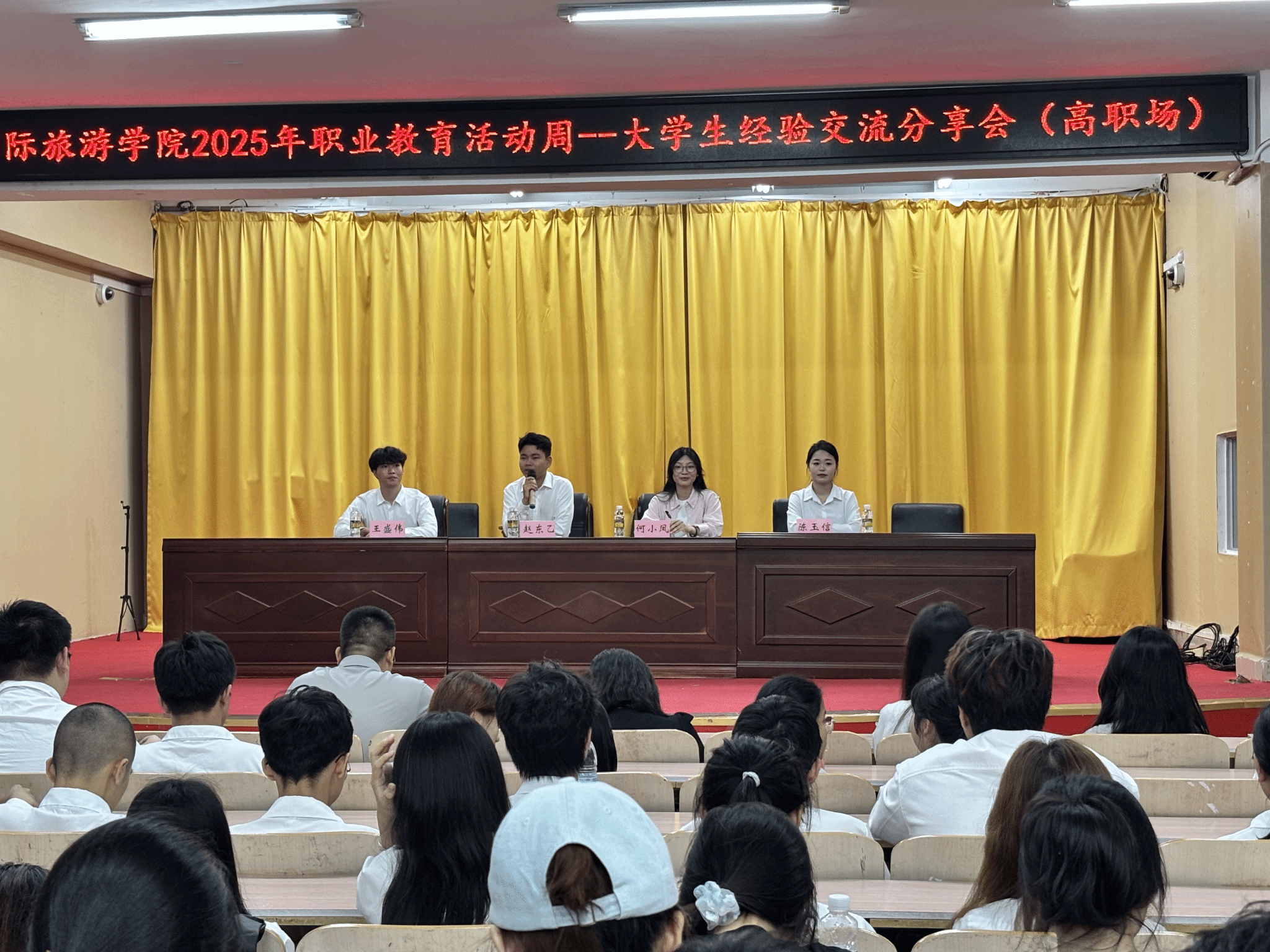 2025年5月12日,我院“大学生经验交流分享会(高职场)”在图书馆报告厅成功举办。本次分享会以“实践·成长·突破”为主题,邀请23级连锁经营与管理专业赵东乙、23级酒店管理专业王盛伟与陈玉信、21级旅游英语专业优秀毕业生何小凤作为主讲嘉宾,围绕学生干部履职、技能竞赛、志愿服务及升学深造等主题展开分享,为在座师生呈现了一场生动的职业教育实践课。