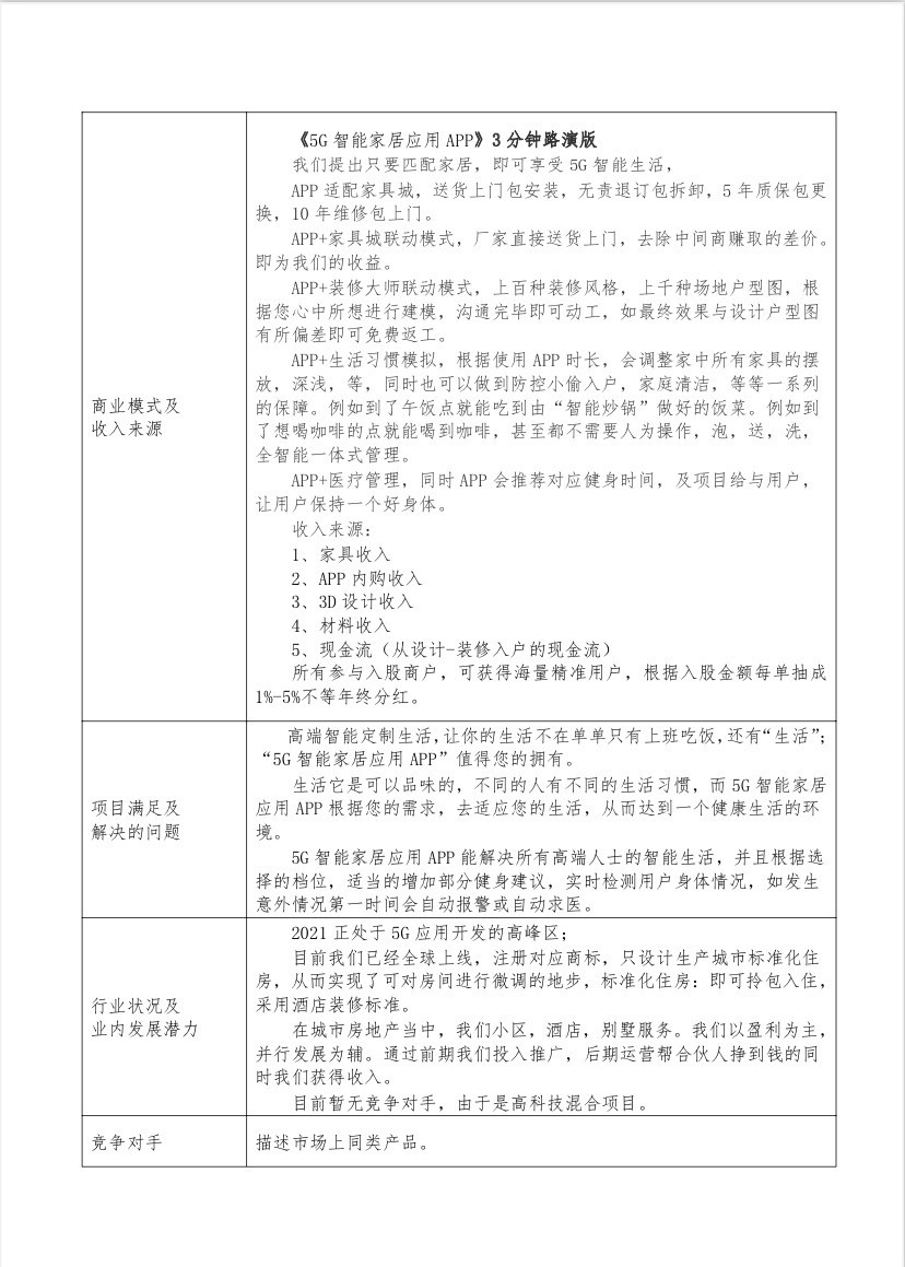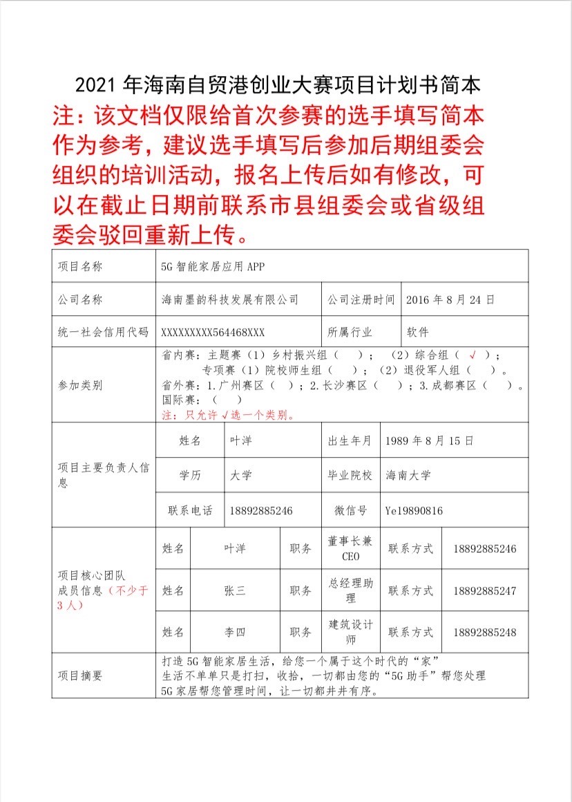 2021年海南自贸港创业大赛项目计划书简本——范本