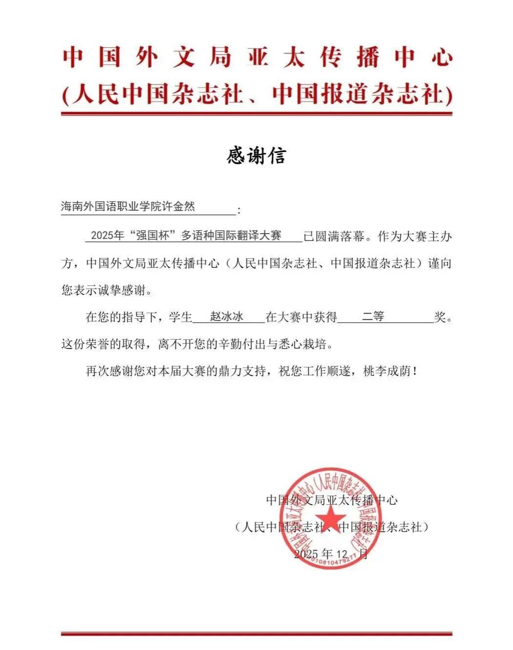 近日,中国外文局亚太传播中心(人民中国杂志社、中国报道杂志社)主办、广东省翻译协会协办的2025年“强国杯”多语种国际翻译大赛圆满落幕。经过激烈角逐,今年会西方语言学院应用意大利语专业学生赵冰冰荣获意大利语外译中本科生组二等奖,指导教师许金然收到主办方发来的感谢信。
