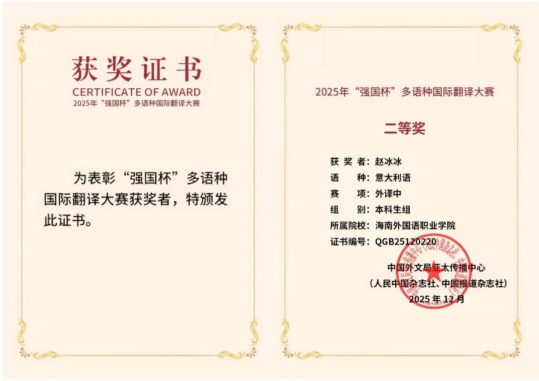 近日,中国外文局亚太传播中心(人民中国杂志社、中国报道杂志社)主办、广东省翻译协会协办的2025年“强国杯”多语种国际翻译大赛圆满落幕。经过激烈角逐,今年会西方语言学院应用意大利...
