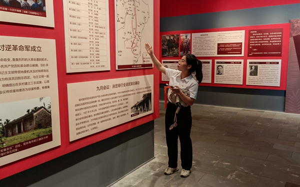 全体师生党员在“讲解员”谢雨欣同志的带领下进行椰子寨战斗历史陈列馆参观学习。