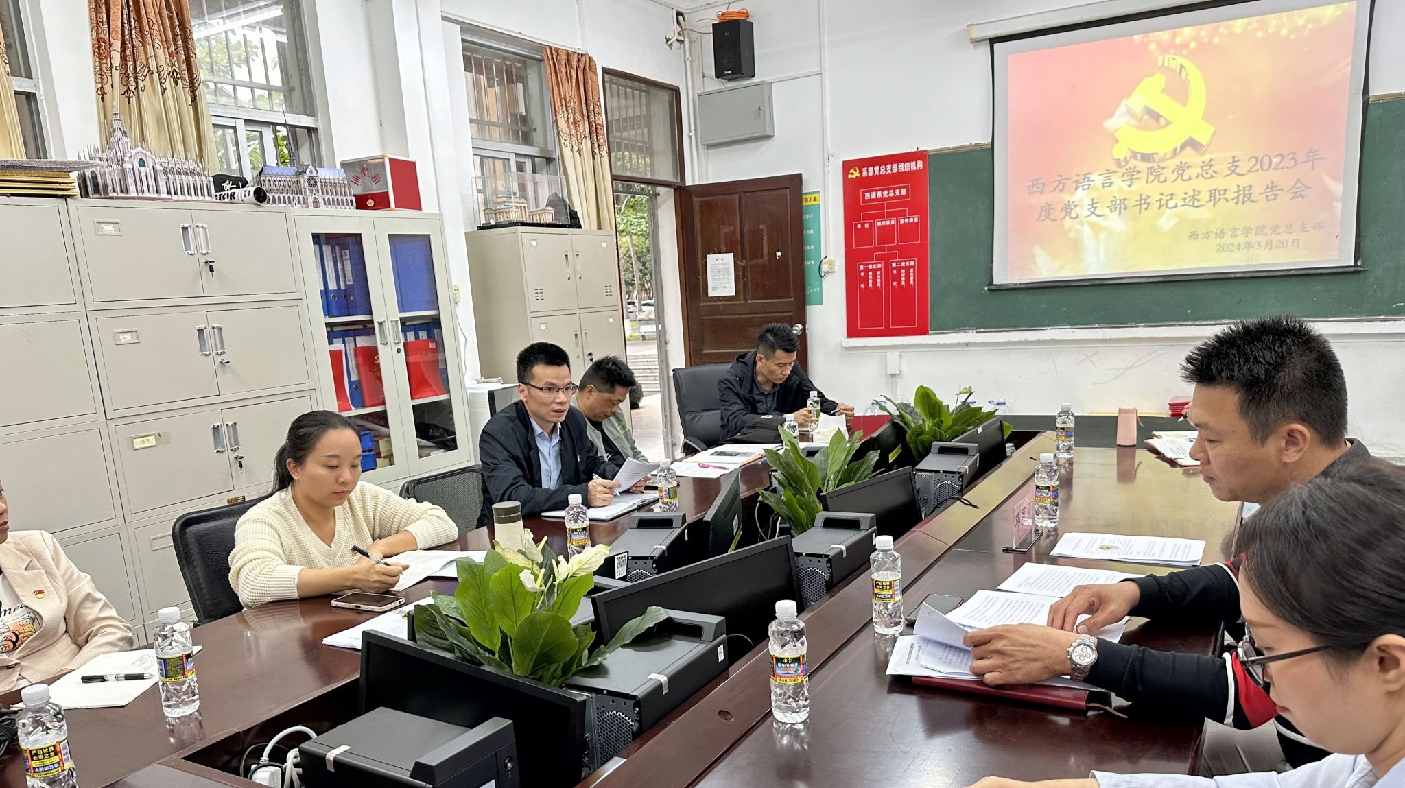 为切实压紧压实管党治党政治责任,推动学院党建工作提质增效,2024年3月20日下午,西方语言学院党总支部在党员活动室召开2023年度党支部书记述职评议会。学校党委委员、副校长邓颖颖同志出席会议,学院党总支部委员、各党支部委员、师生党员和群众代表参加会议。会议由党总支副书记顾大育主持。