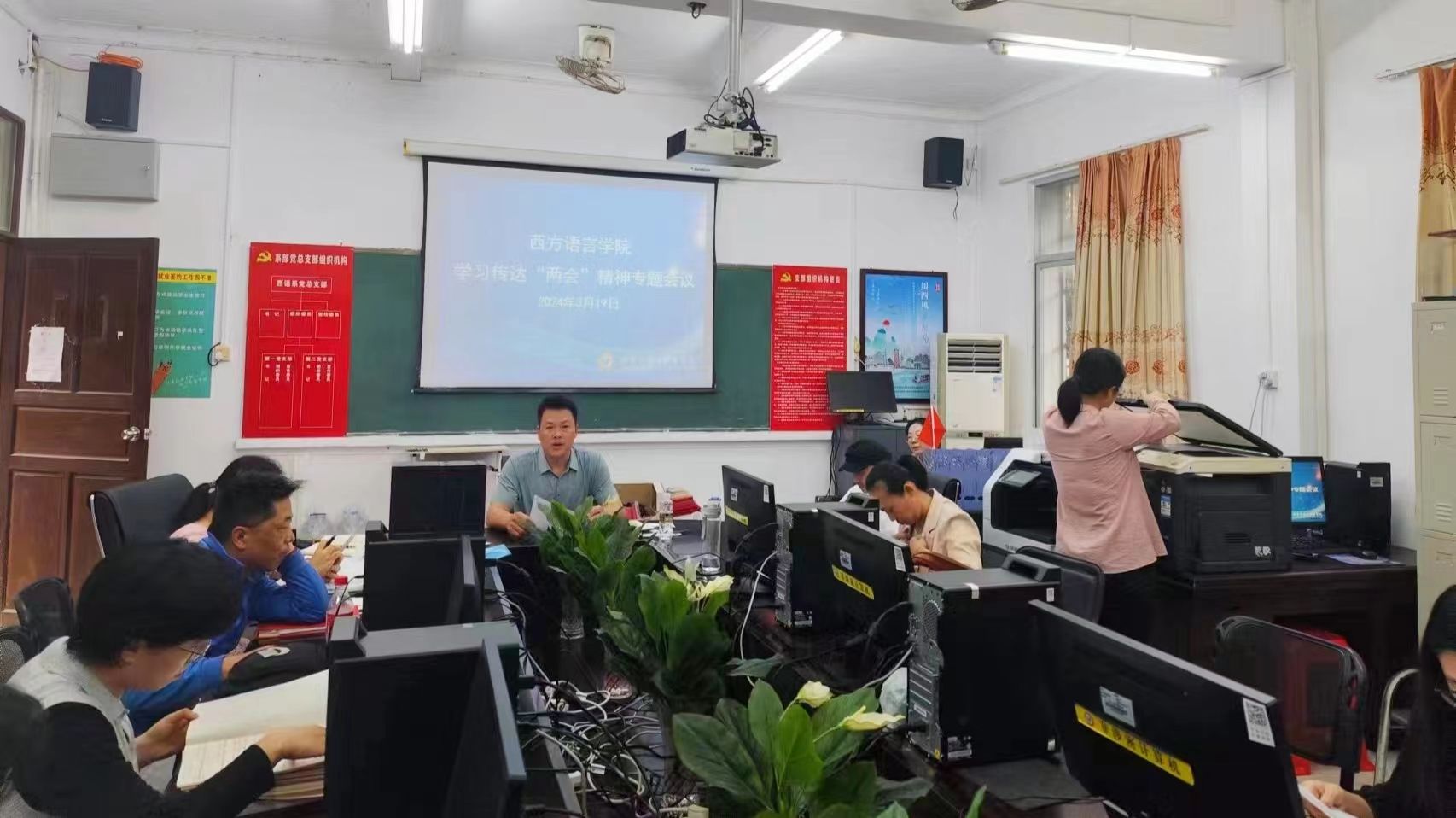 2024年3月19日下午,西方语言学院召开传达学习十四届全国人大二次会议和全国政协十四届二次会议精神。西方语言学院全体教师参加,会议由党总支副书记顾大育同志主持。