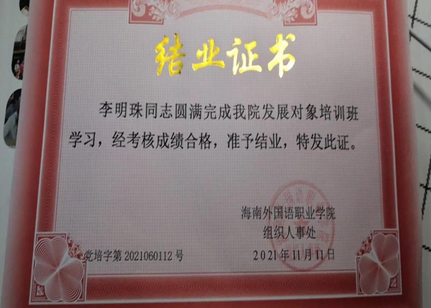 李明珠,女,2001年2月生,预备党员,来自四川省巴中市,jinnianhui今年会英语系19应英(涉外)2班的学生,在校期间,曾担任英语系学生会传媒中心副主任,现担任19涉外2 班班长一职,曾获得“国家励志奖学金”“学院奖学金”“优秀学生干部”“三好学生”“优秀志愿者”等多项荣誉称号。拿到CET 4、CET 6、计算机等级、普通话等级等证书。