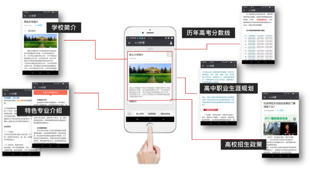 中国教育在线为高校独家提供面向全国高中的移动端信息发布平台——“高中微平台”。该项目主要依托移动互联手段,为全国高中学校提供移动端微信公众平台的建设与维护服务,并以此为信息传递渠道,定期将高校的招考政策发布至对口高中的公众号内,实现高校与高中之间的信息对称。作为全国唯一的高中微信端信息发布平台,中国教育在线“高中微平台”目前已与近千所高中达成独家长效合作,高校可通过所有对口高中的微信公众号及时发布招生政策与专业信息,实现目标生源的全面覆盖。中国教育在线以高中微信公众号为信息传递渠道,定期将合作高校的招生简章、专业介绍等相关高招资讯以文章发布形式传递至对口高中的微信公众号,使招生信息准确传播至目标群体。合作内容:由学校自选“合作高中学校汇总”中的高中。