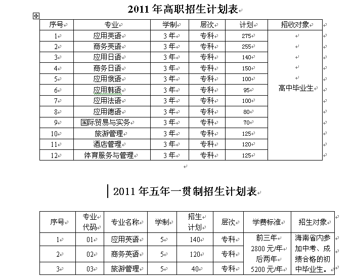 我院2011年招生计划